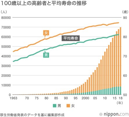 平成30年厚生労働省の簡易生命表の概況によりますと、日本人の平均寿命は男性で81.25年(世界3位)、女性で87.32年(世界2位)でいずれも過去最高を更新しました。また100歳以上の人口は69,785人(前年比+2,014人)となり、そのうちの約88%が女性です。