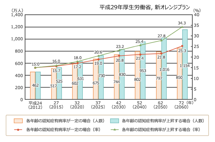 平均寿命の更新とともに、認知症数も増加すると想定され、平成29年厚生労働省の新オレンジプランによると2025年には認知症数は日本で700万人に達すると言われております。これは減りつつある日本の人口を鑑みると、全人口の7%に相当し、パーキンソン病患者数(約20万人)の約35倍、てんかん患者数(約100万人)の約7倍、糖尿病患者数(約315万人)の2倍以上に相当します。