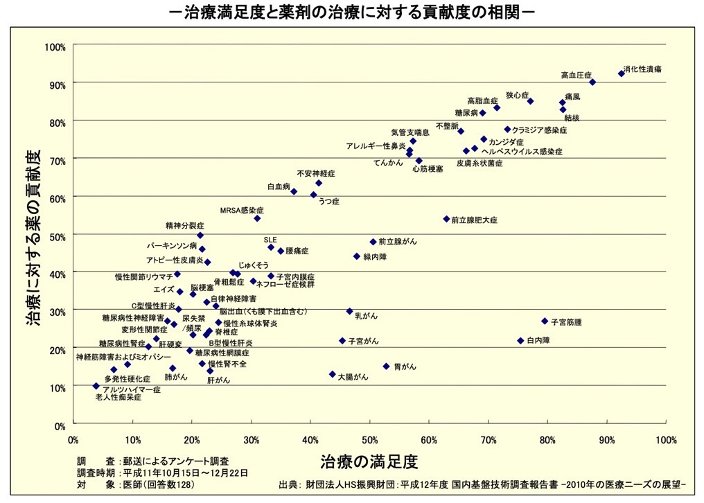 増えつつある認知症患者に対して早急な治療が望まれますが、実情は厳しいものです。平成11年治療に対する薬の貢献度と医師の治療満足度のデータでは、認知症治療に関しては、薬の貢献度も、また医師の治療満足度も最も低いものにものになりました(下図をクリックで拡大)。