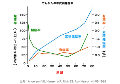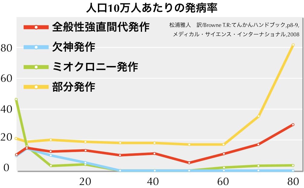 - てんかんの有病率はおよそ1%と言われるが、65歳で1%を越え、80歳で2%程度になる。