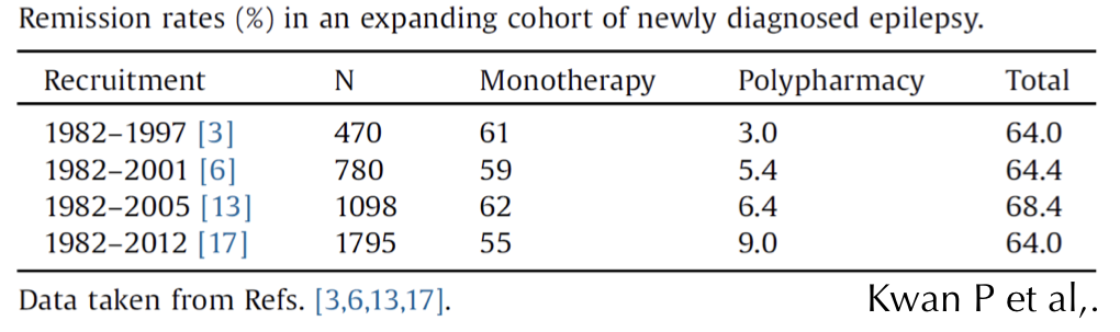 てんかんは、発生率約1%と言われる一般的病気です。最近の疫学調査は60歳から発生率が増える病気であることがわかりました(下図左)。これには脳の老化が関係していると言われ、幼少期の発作メカニズムとは異なる機序が考えられています。適切な診断を行い早期に治療介入すれば約64%が発作消失したと言うデータもあります(下図右)。従って、全身性の発作のみならず、意識消失などが繰り返し起こるようであれば早期の専門医受診をお勧めいたします。