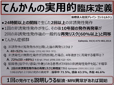 初発発作が起こった場合の再発リスクは40~52%、2回発作が起こった場合の3回目の発作は確率は73%との報告があります。そのため、初回発作は経過観察とし、2回発作が起こった時から内服治療が積極的に行われる傾向にありました。しかし、発作回数だけで治療開始時期を判断するのは適切ではないため、各発作に対しこれまでのデータから重み付けがなされるようになりました。その結果、初回の発作であったとしても、MRI上異常があったり、脳波異常があったり、高齢者であったりした場合は積極的に内服治療が開始することが勧められ、発作が起こったこと以外に脳波、MRIで異常がなかった場合は、2回目の発作で治療を開始する従来通りの治療方針が勧められるようになりました。